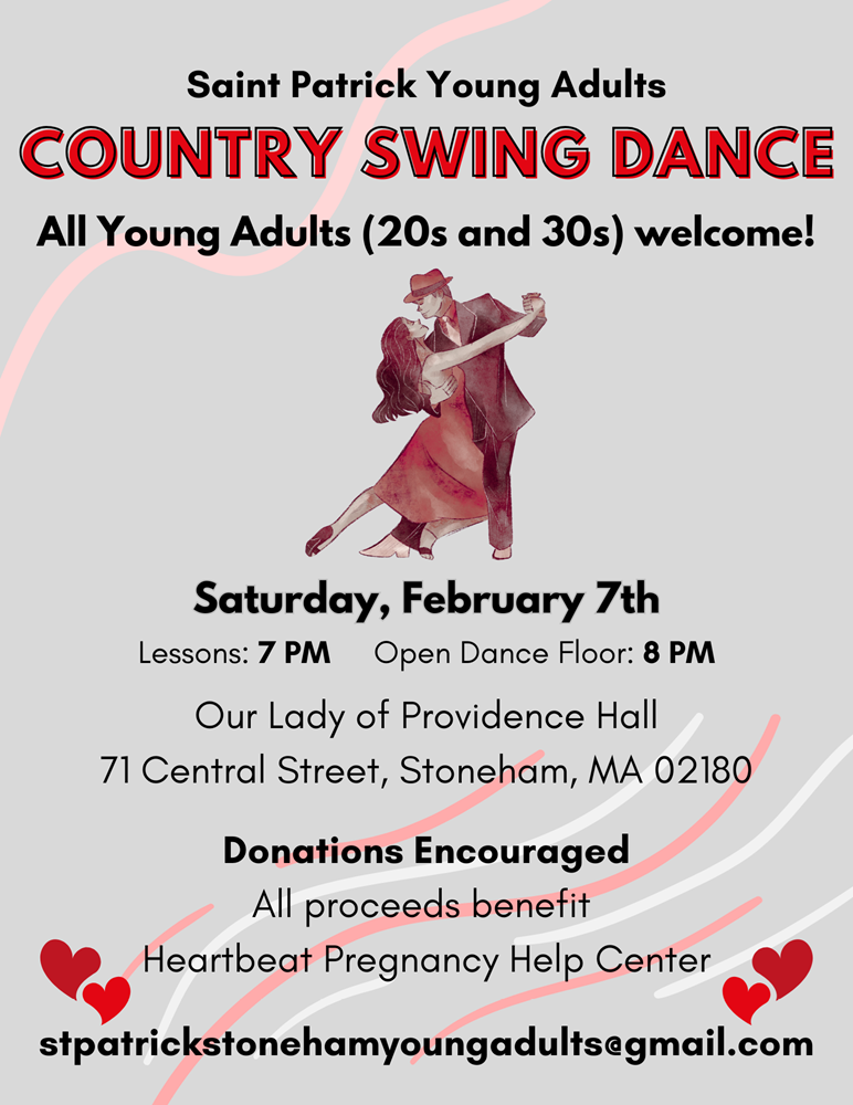Registration is required by February 3rd. Please contact Diane McCarthy at dianemccarthy@stpatrickstoneham.org or 781-438-0200.